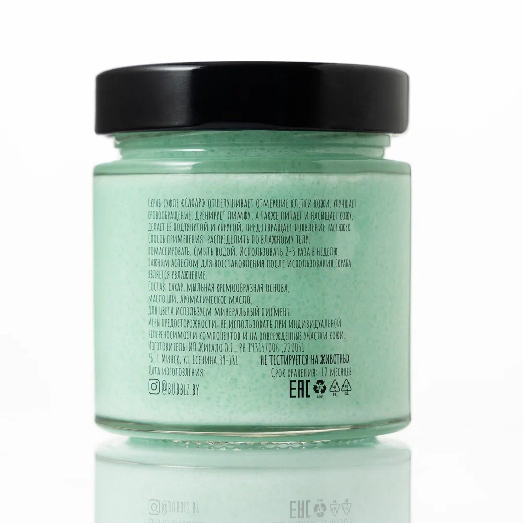 Скраб для тела от #BUBBLZ изготавливается из натуральных ингредиентов, что делает его безопасным для кожи и сводит к минимуму риск раздражения или аллергических реакций. Тающие частички сахара мягко и нежно удаляют ороговевшие клетки и загрязнения, стимулируют обновление тканей и улучшают цвет и текстуру кожи. Регулярное использование скраба сделает вашу кожу гладкой, мягкой и шелковистой. В дополнение, скраб станет приятной находкой для тех, кто ценит роскошные и притягательные ароматы.