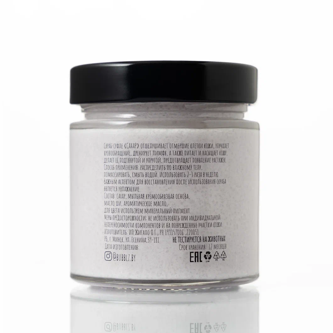 Скраб для тела от #BUBBLZ изготавливается из натуральных ингредиентов, что делает его безопасным для кожи и сводит к минимуму риск раздражения или аллергических реакций. Тающие частички сахара мягко и нежно удаляют ороговевшие клетки и загрязнения, стимулируют обновление тканей и улучшают цвет и текстуру кожи. Регулярное использование скраба сделает вашу кожу гладкой, мягкой и шелковистой. В дополнение, скраб станет приятной находкой для тех, кто ценит роскошные и притягательные ароматы.