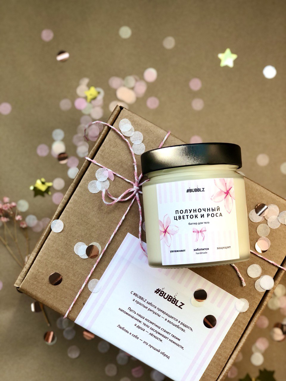 Нежное и женственное оформление этикетки баттера делает его идеальным подарком и для ваших родных и друзей. Подарите им заботу о себе и возможность насладиться натуральной косметикой!